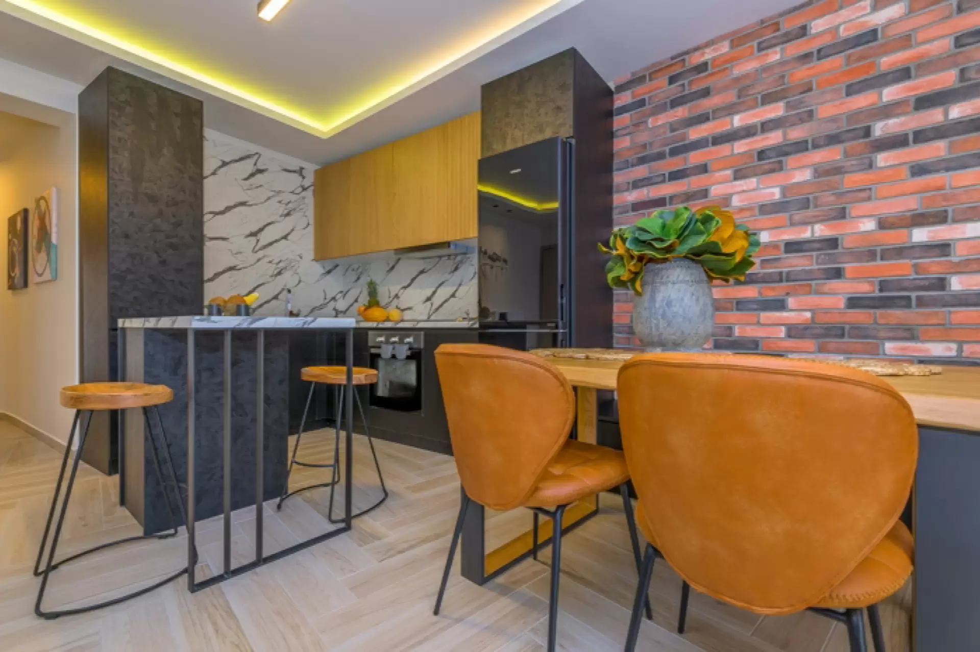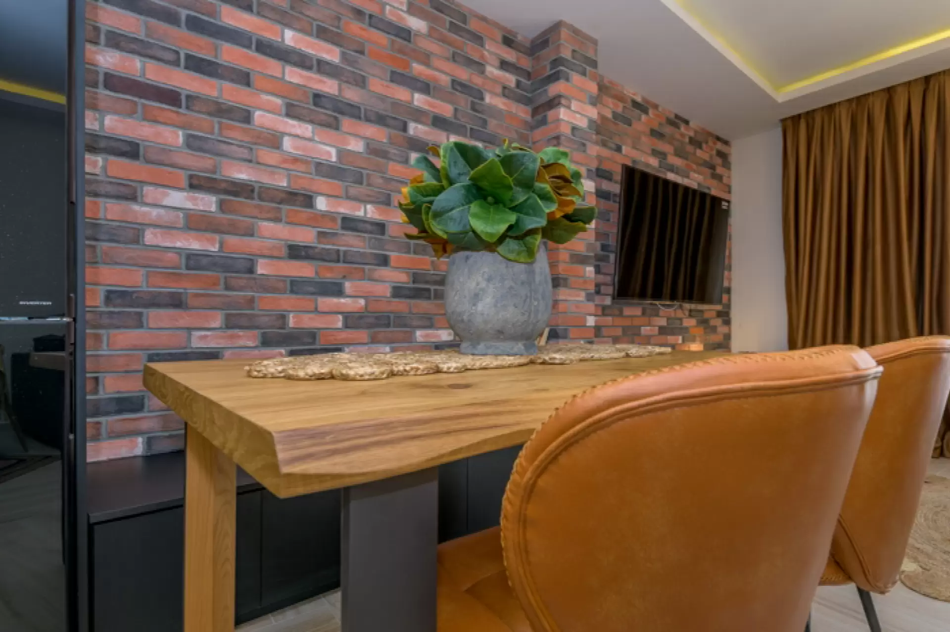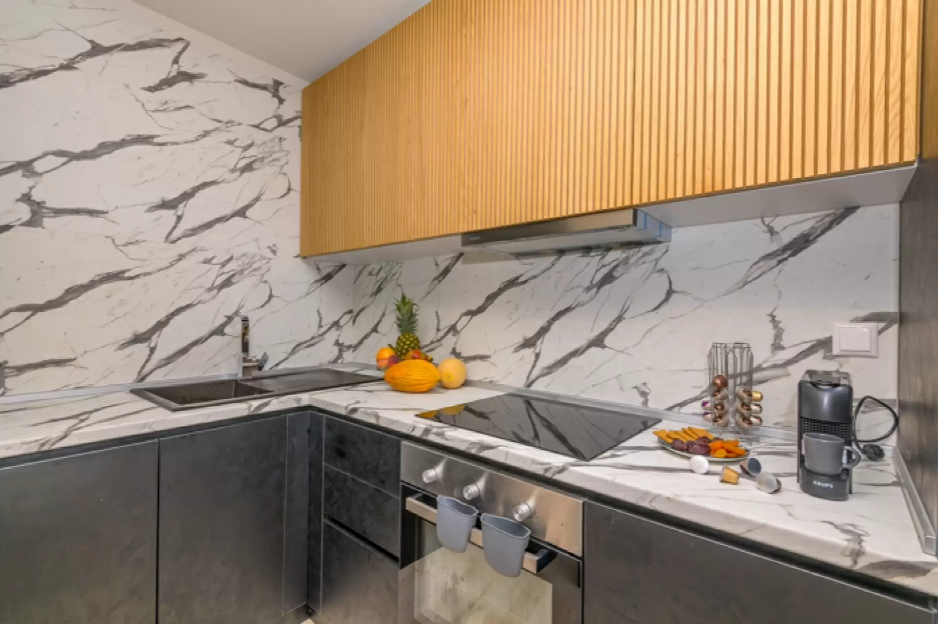 Entering this apartment, you will find a comfortable living room with a cozy sofa and high-tech flat screen TV for your entertainment needs. Additionally, the kitchen is fully equipped with all the necessary stuff.