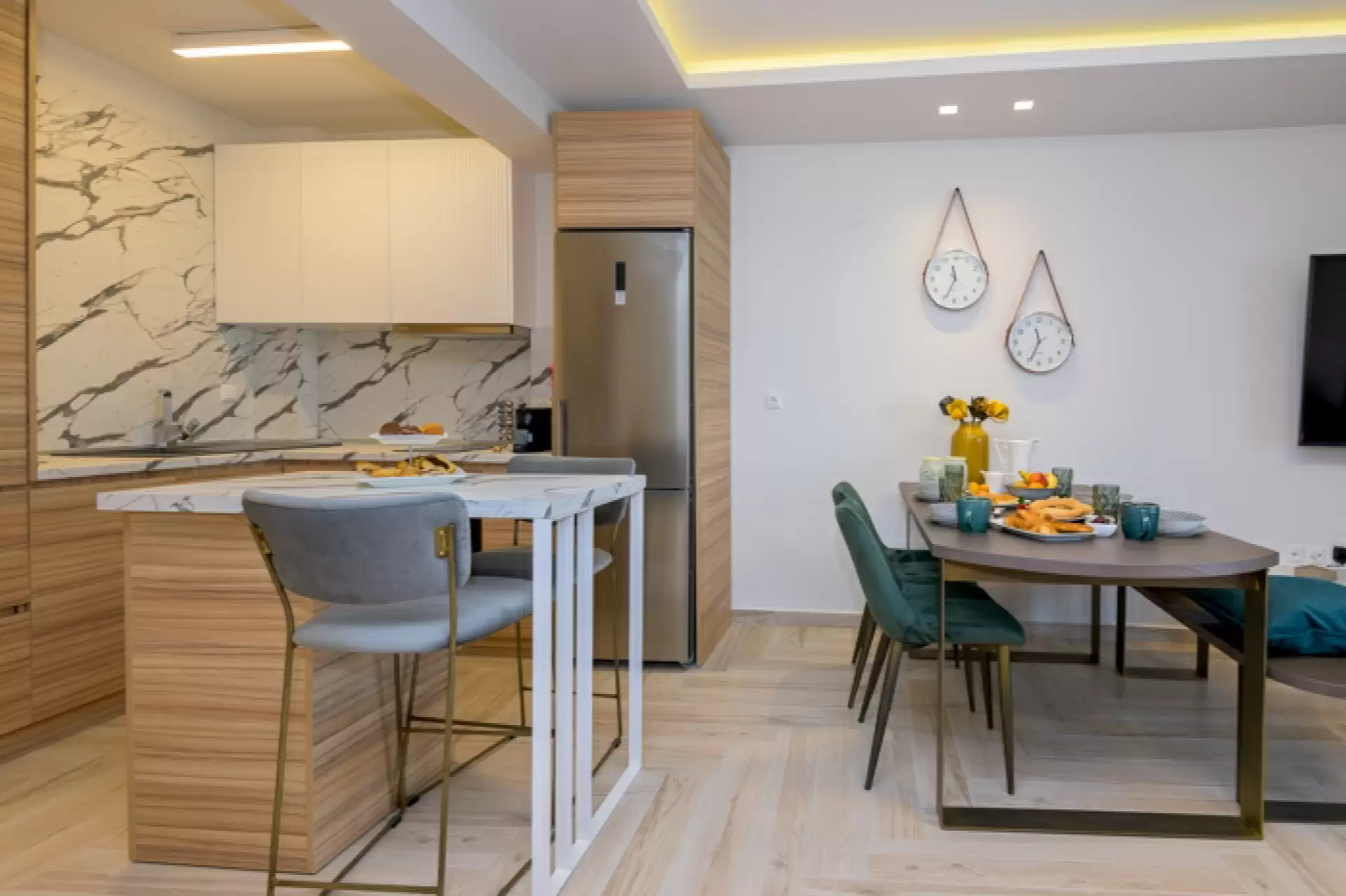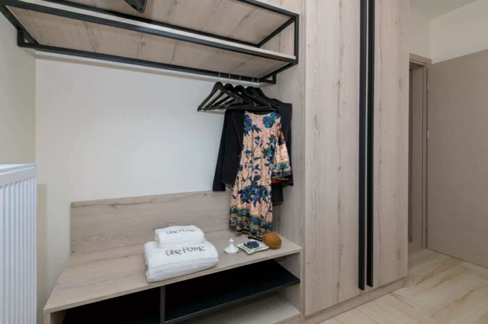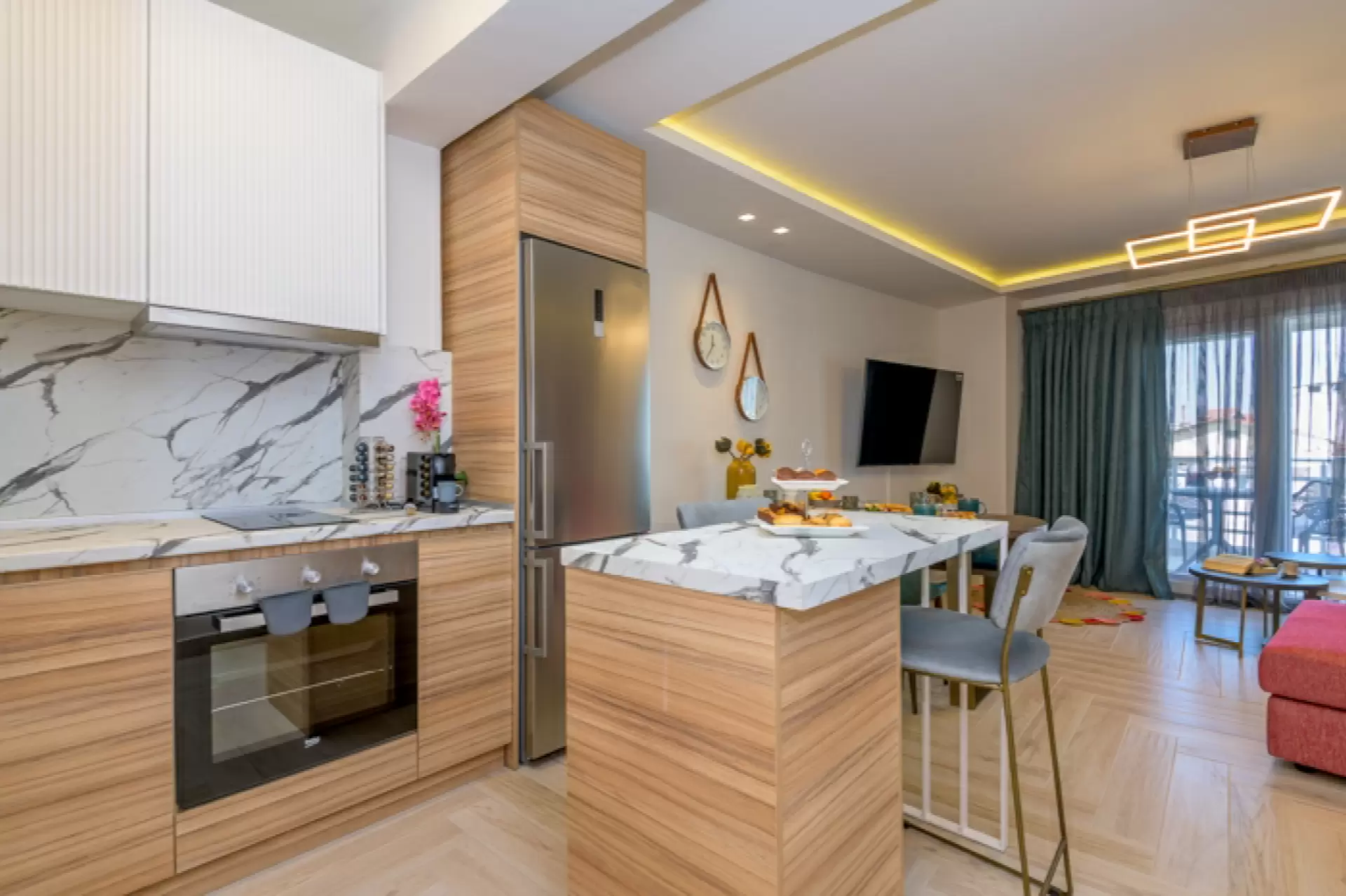 Entering this apartment, you will find a comfortable living room with a cozy sofa and high-tech flat screen TV for your entertainment needs. Additionally, the kitchen is fully equipped with all the necessary stuff.