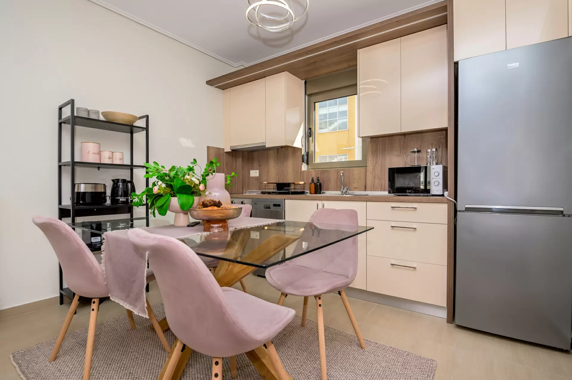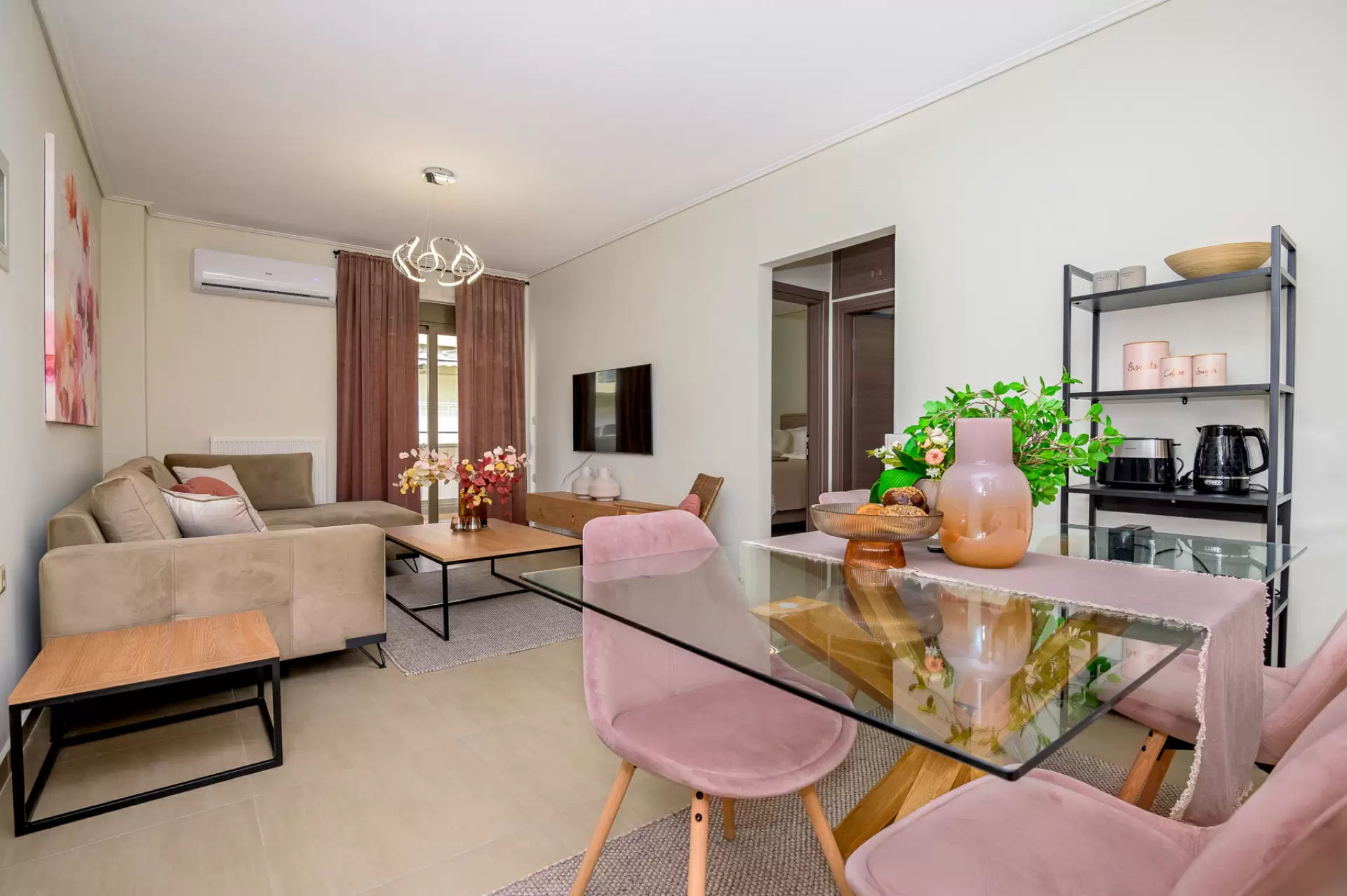 Entering this apartment, you will find a comfortable living room with a cozy sofa and high-tech flat screen TV for your entertainment needs. Additionally, the kitchen is fully equipped with all the necessary stuff.