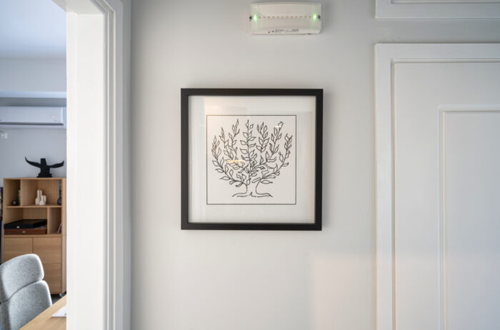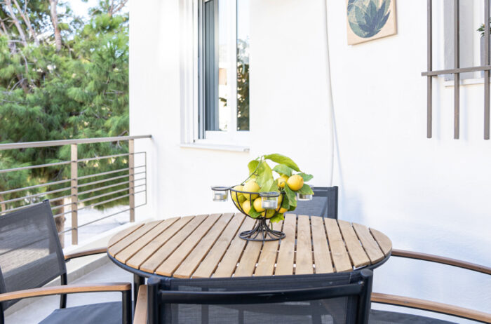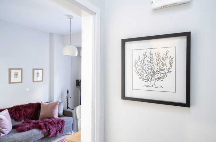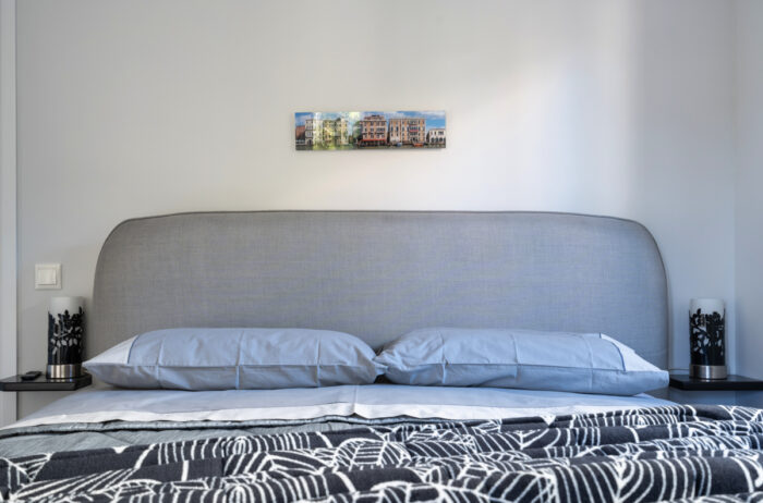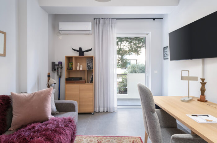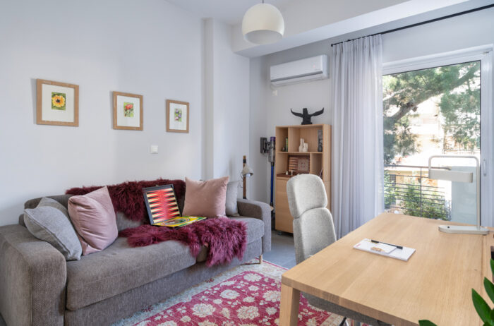 Entering the apartment, you will find a spacious living room with cozy sofas, completed with a table & a high-tech flat screen TV for your entertainment needs. Additionally, the kitchen is fully equipped with all the necessary stuff.