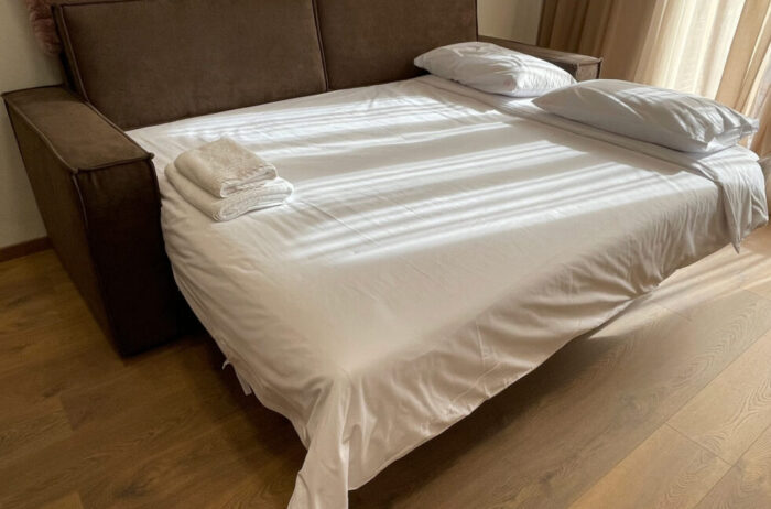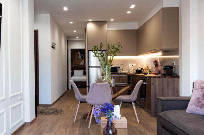 Entering this apartment, you will find a comfortable living room with a cozy sofa and high-tech flat screen TV for your entertainment needs. Additionally, the kitchen is fully equipped with all the necessary stuff.