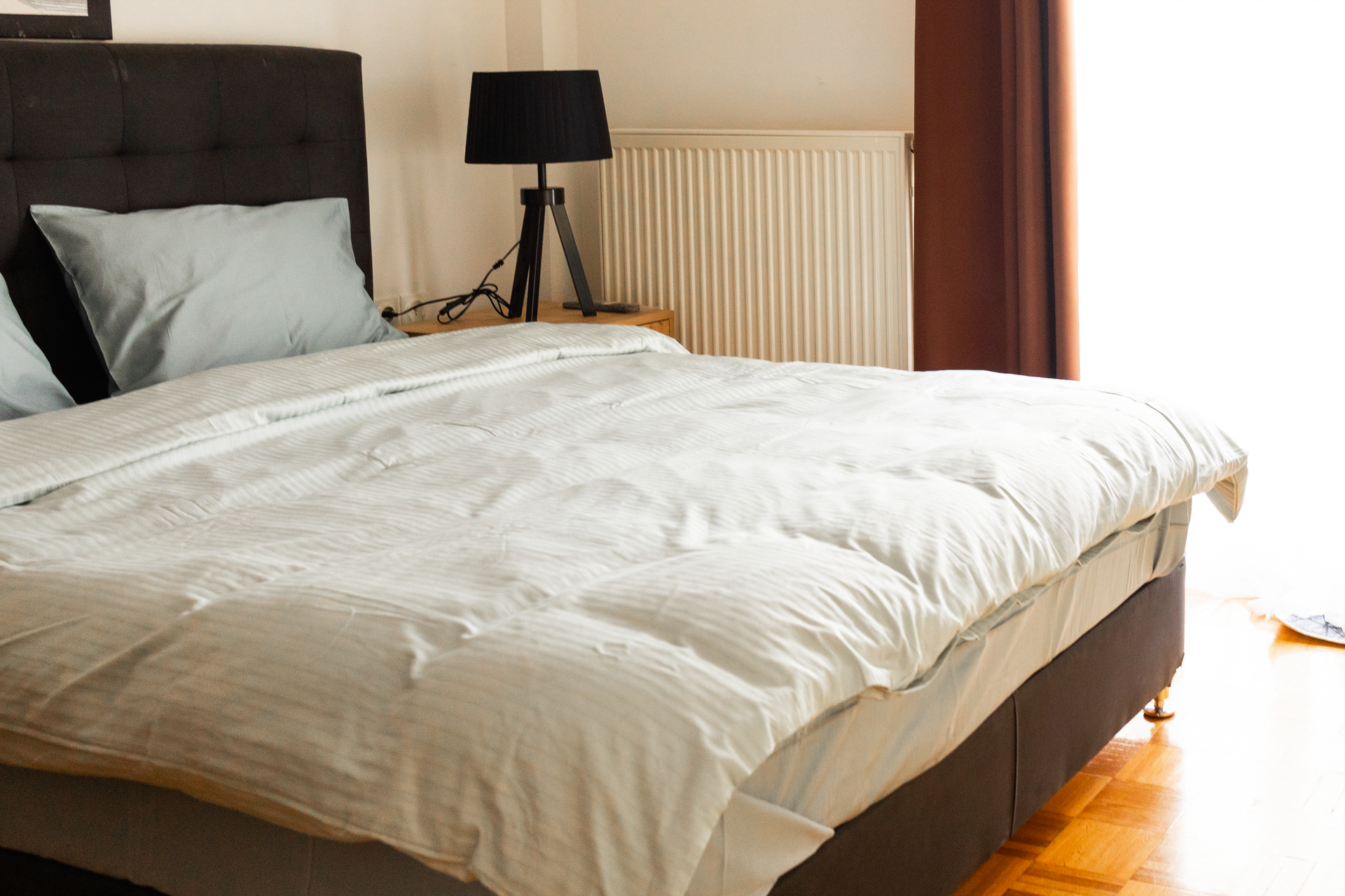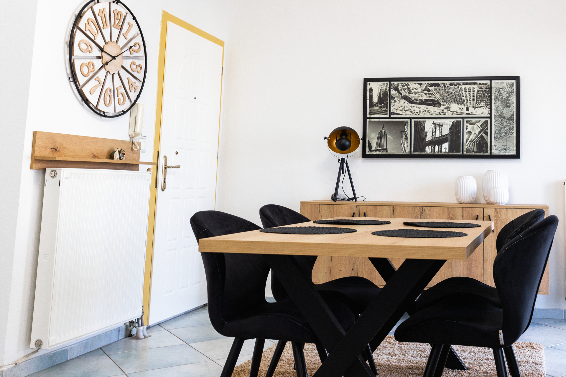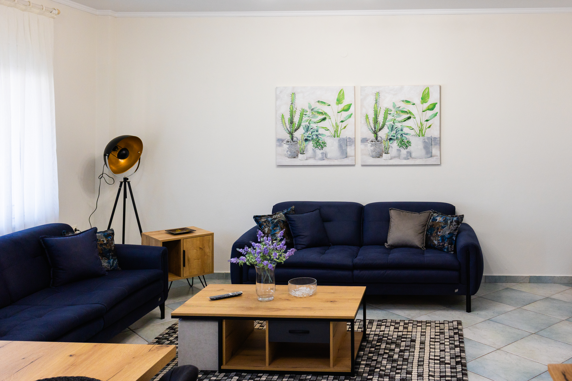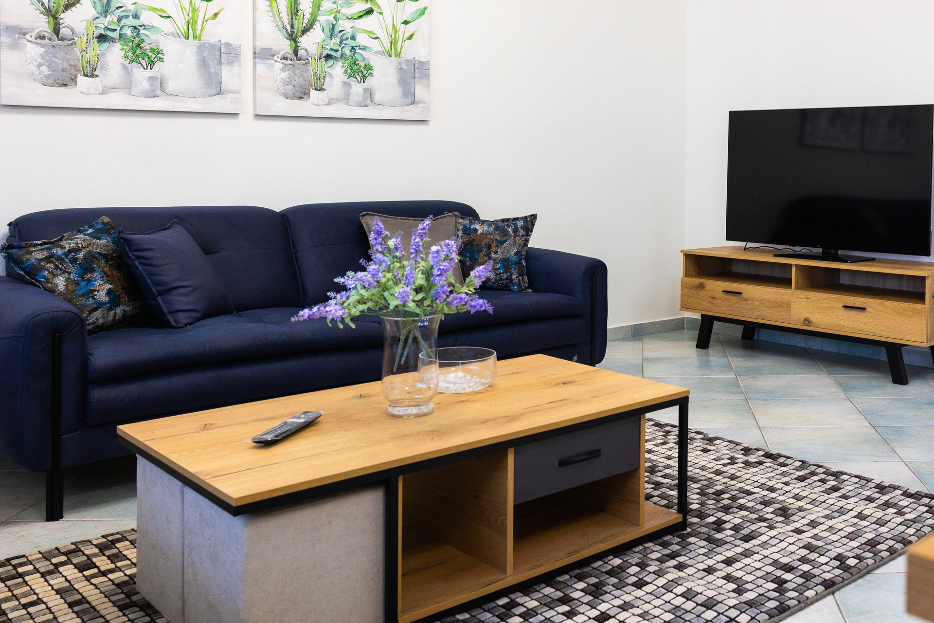Entering this apartment, you will find a comfortable living room with a cozy sofa and high-tech flat screen TV for your entertainment needs. Additionally, the kitchen is fully equipped with all the necessary stuff.