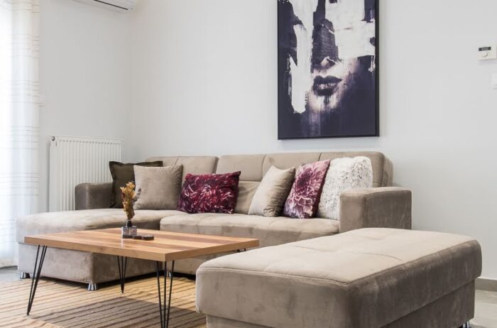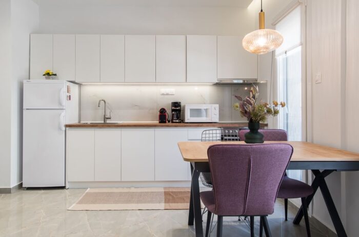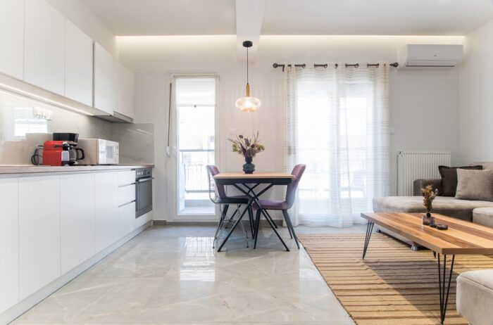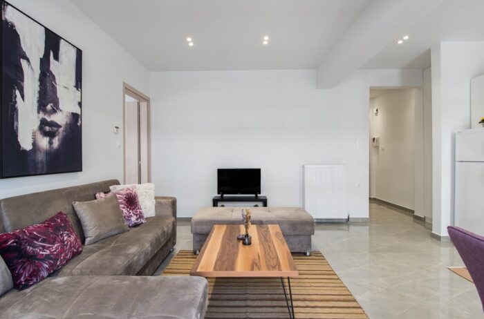 Entering this apartment, you will find a comfortable living room with a cozy sofa and high-tech flat screen TV for your entertainment needs. Additionally, the kitchen is fully equipped with all the necessary stuff.