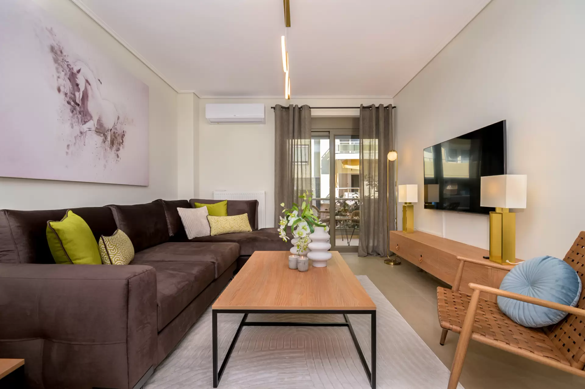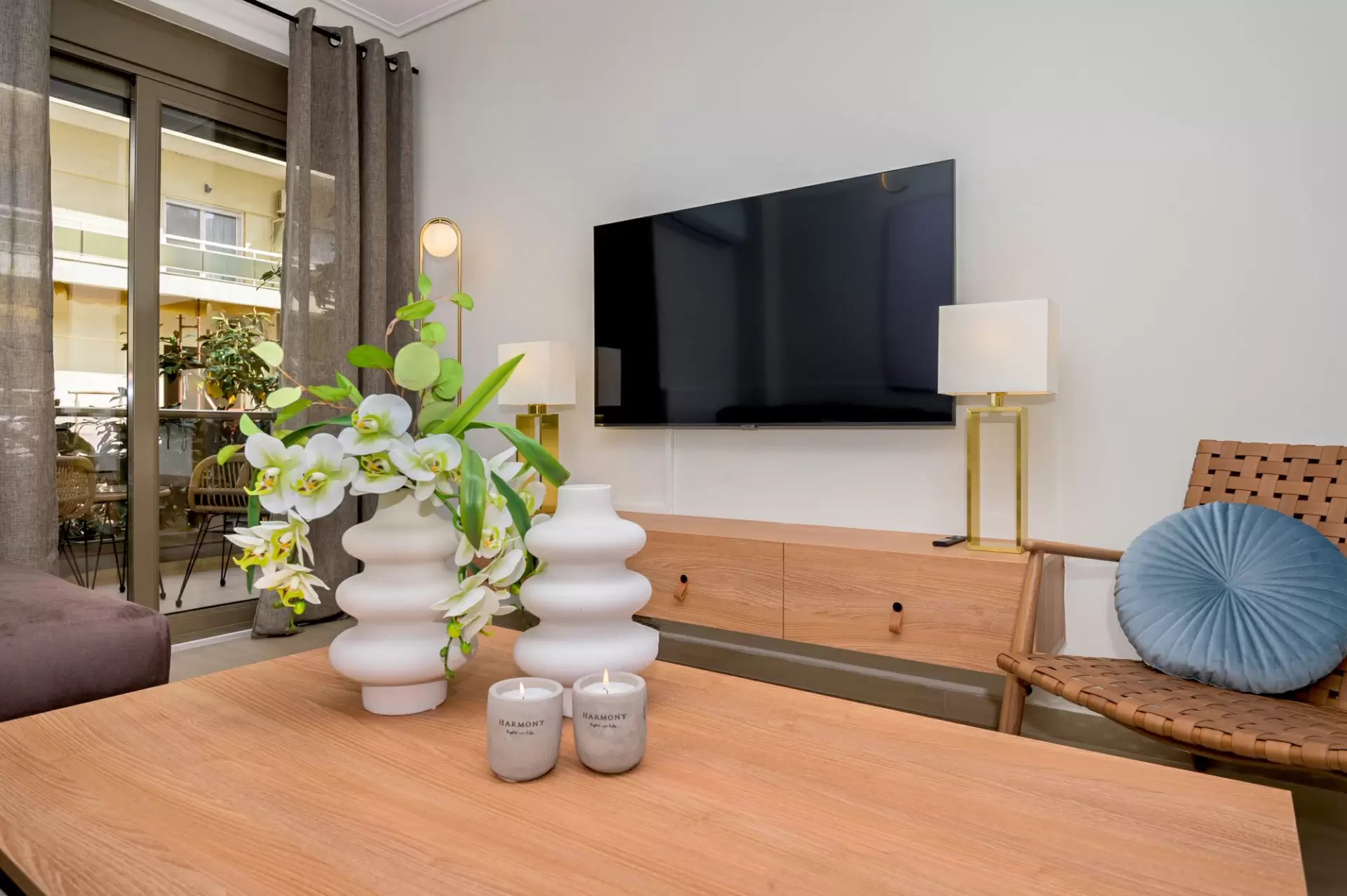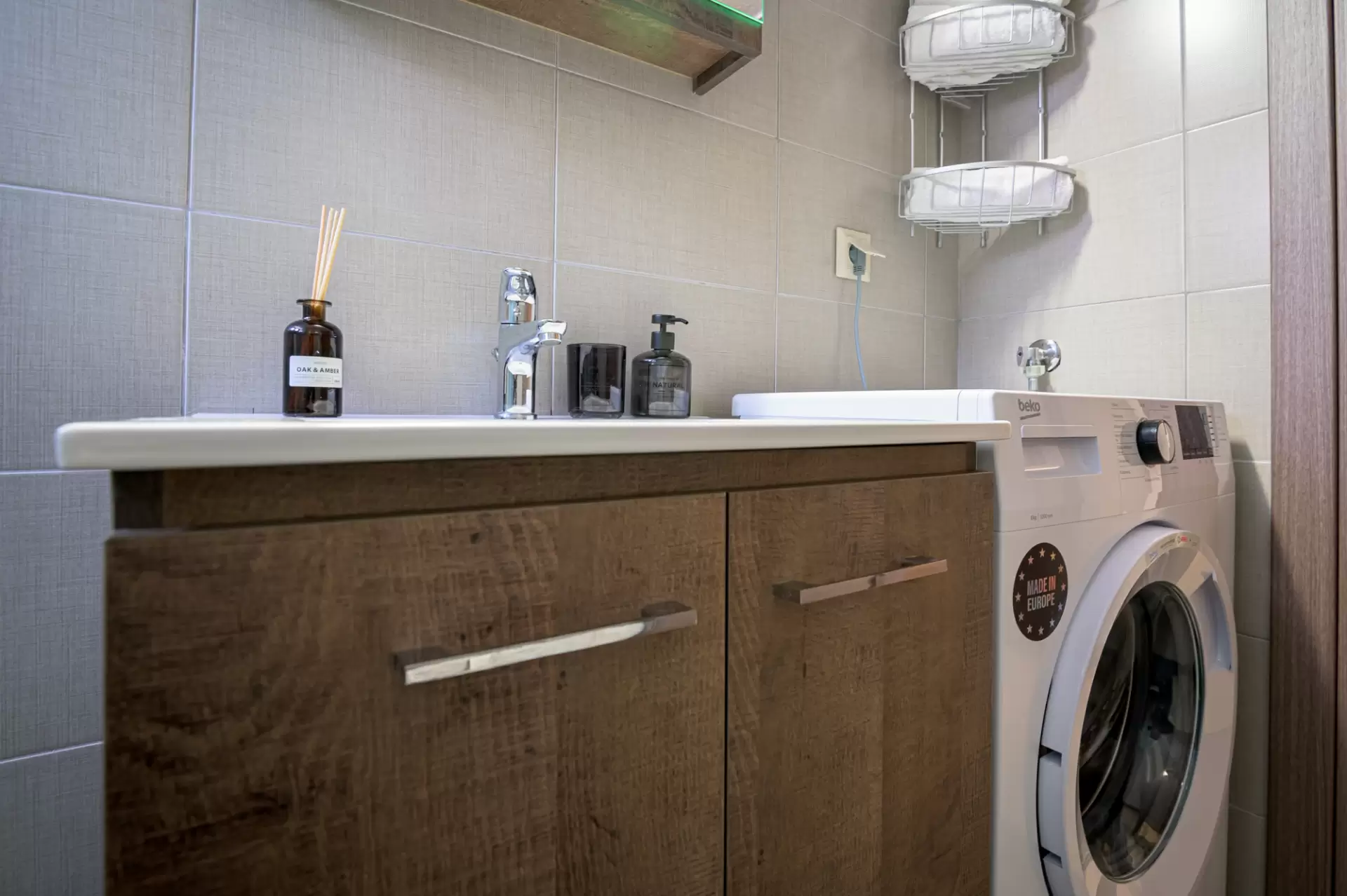 Entering this apartment, you will find a comfortable living room with a cozy sofa and high-tech flat screen TV for your entertainment needs. Additionally, the kitchen is fully equipped with all the necessary stuff.