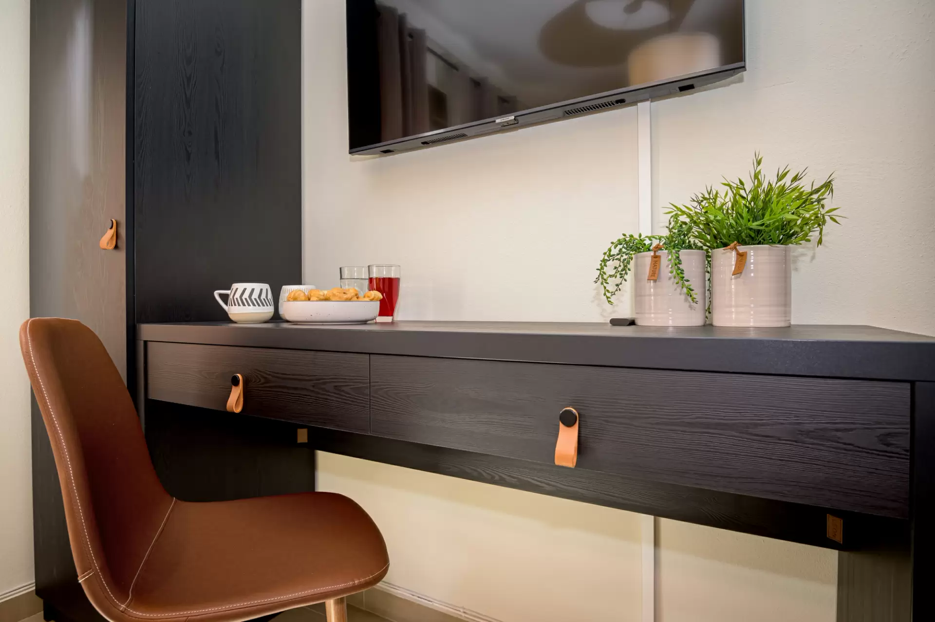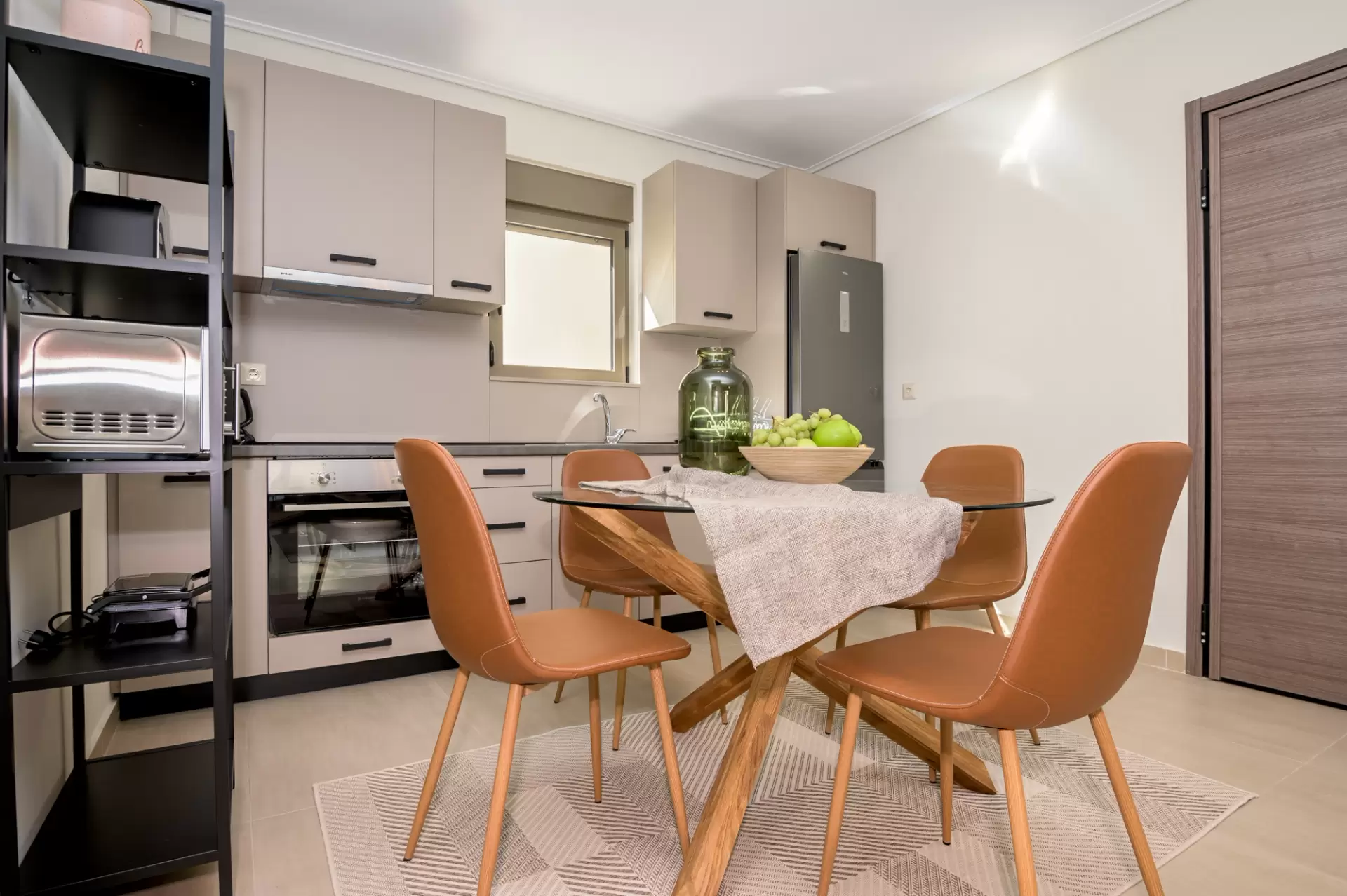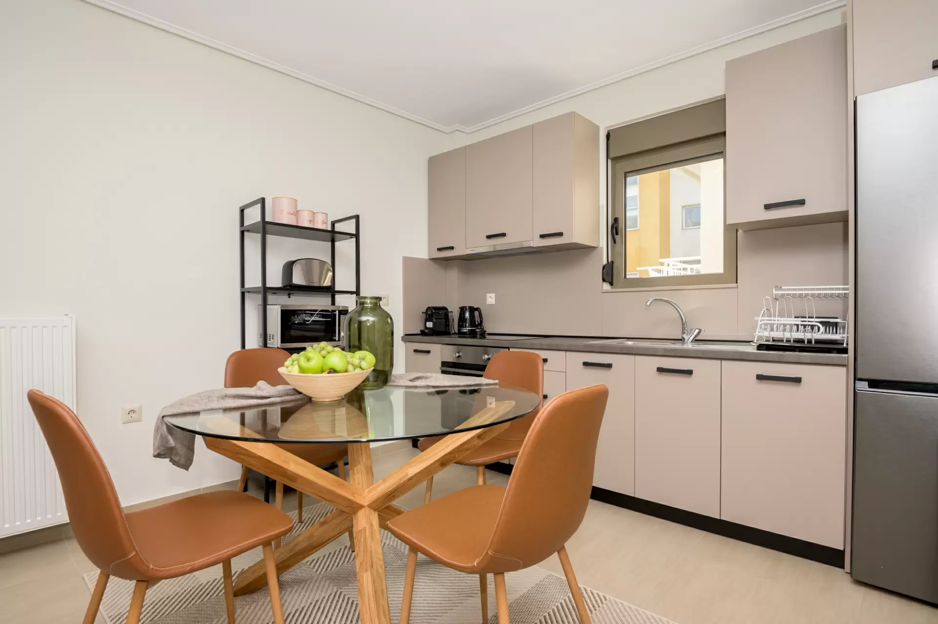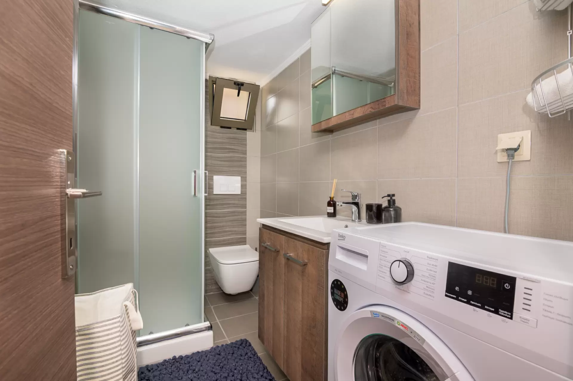 Entering this apartment, you will find a comfortable living room with a cozy sofa and high-tech flat screen TV for your entertainment needs. Additionally, the kitchen is fully equipped with all the necessary stuff.