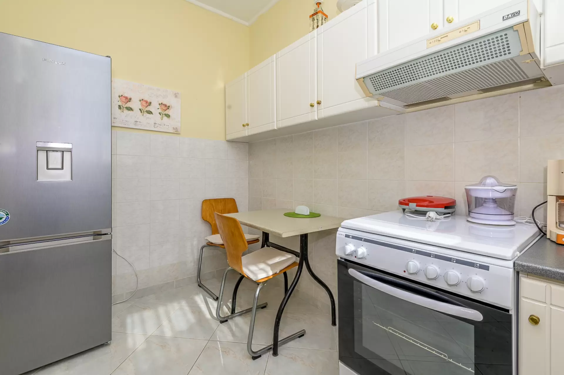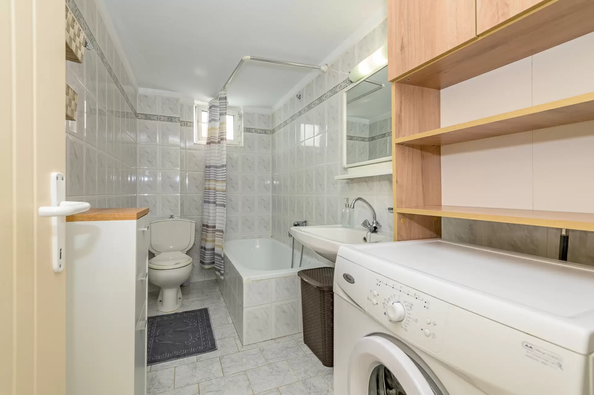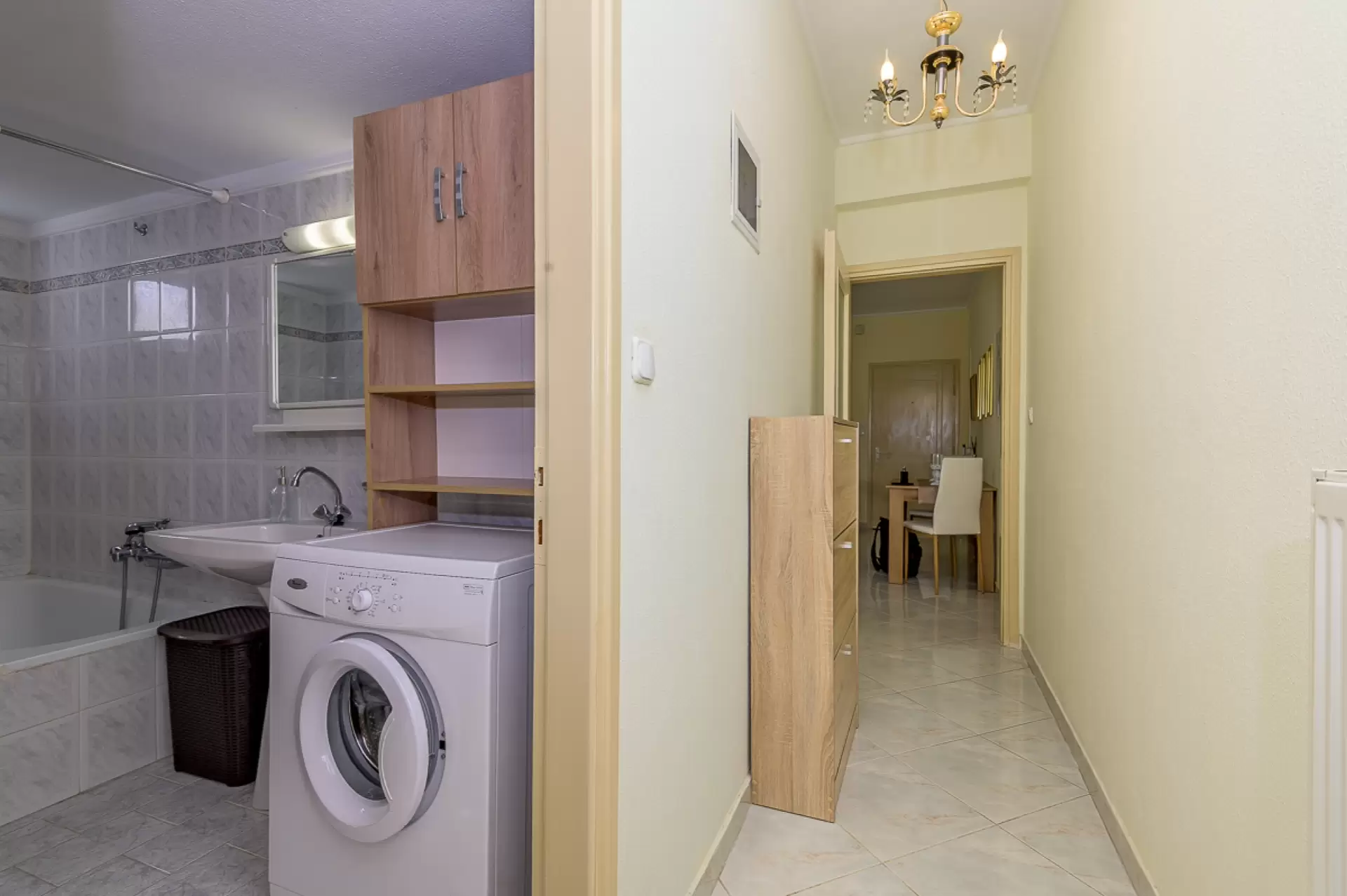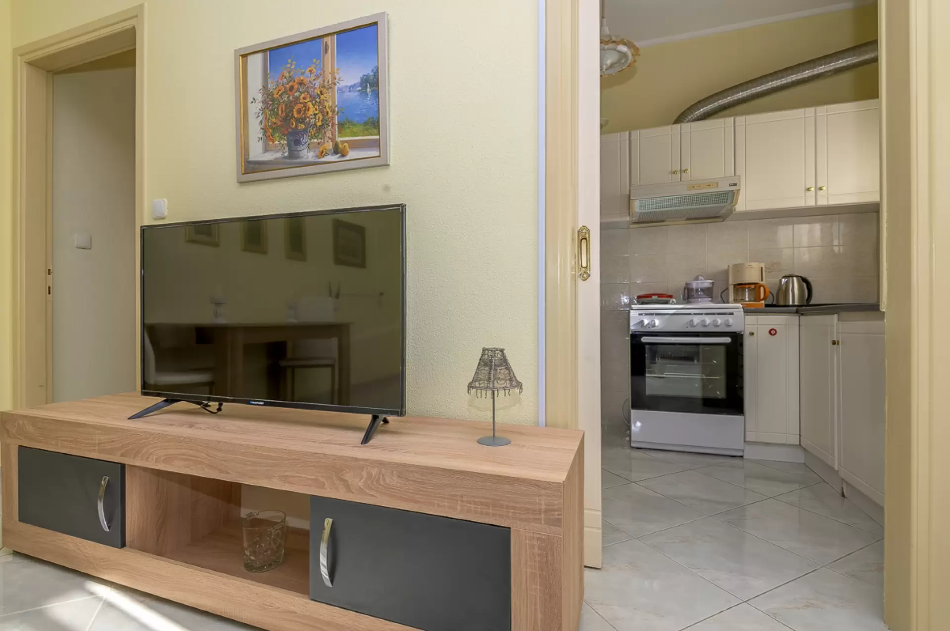 Entering this apartment, you will find a comfortable living room with a cozy sofa and high-tech flat screen TV for your entertainment needs. Additionally, the kitchen is fully equipped with all the necessary stuff.