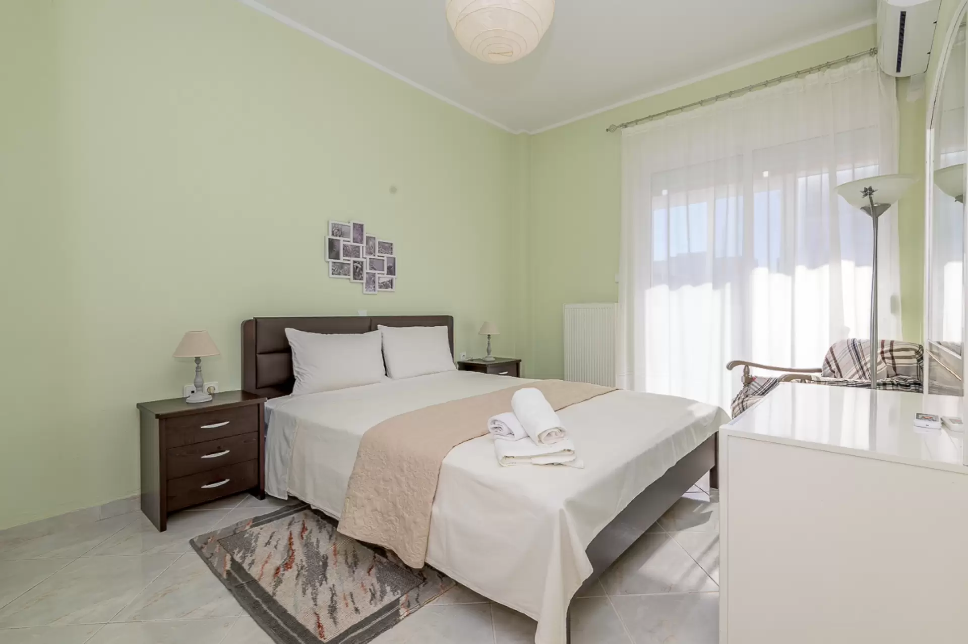 The apartment’s bedroom has a reposeful double bed.