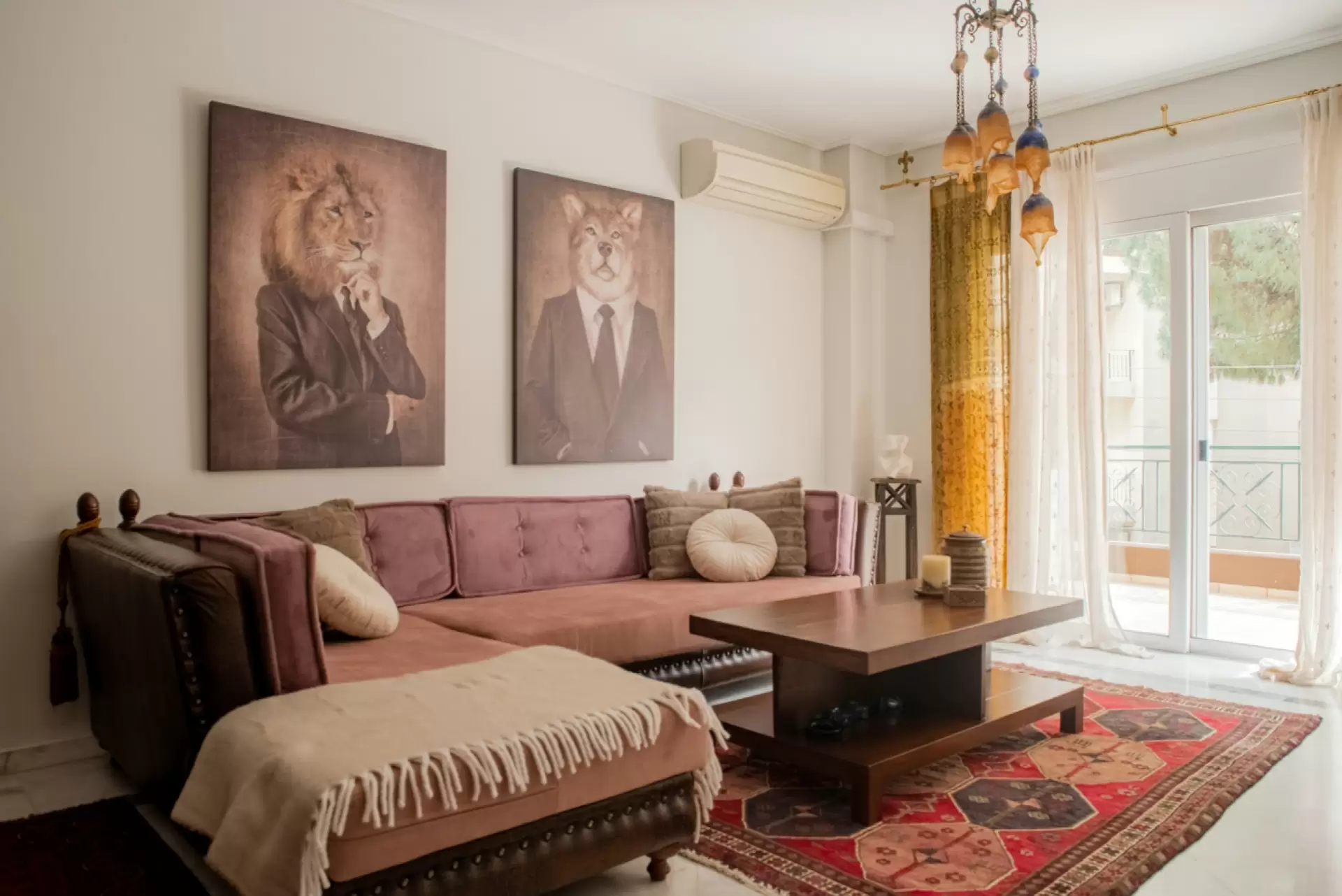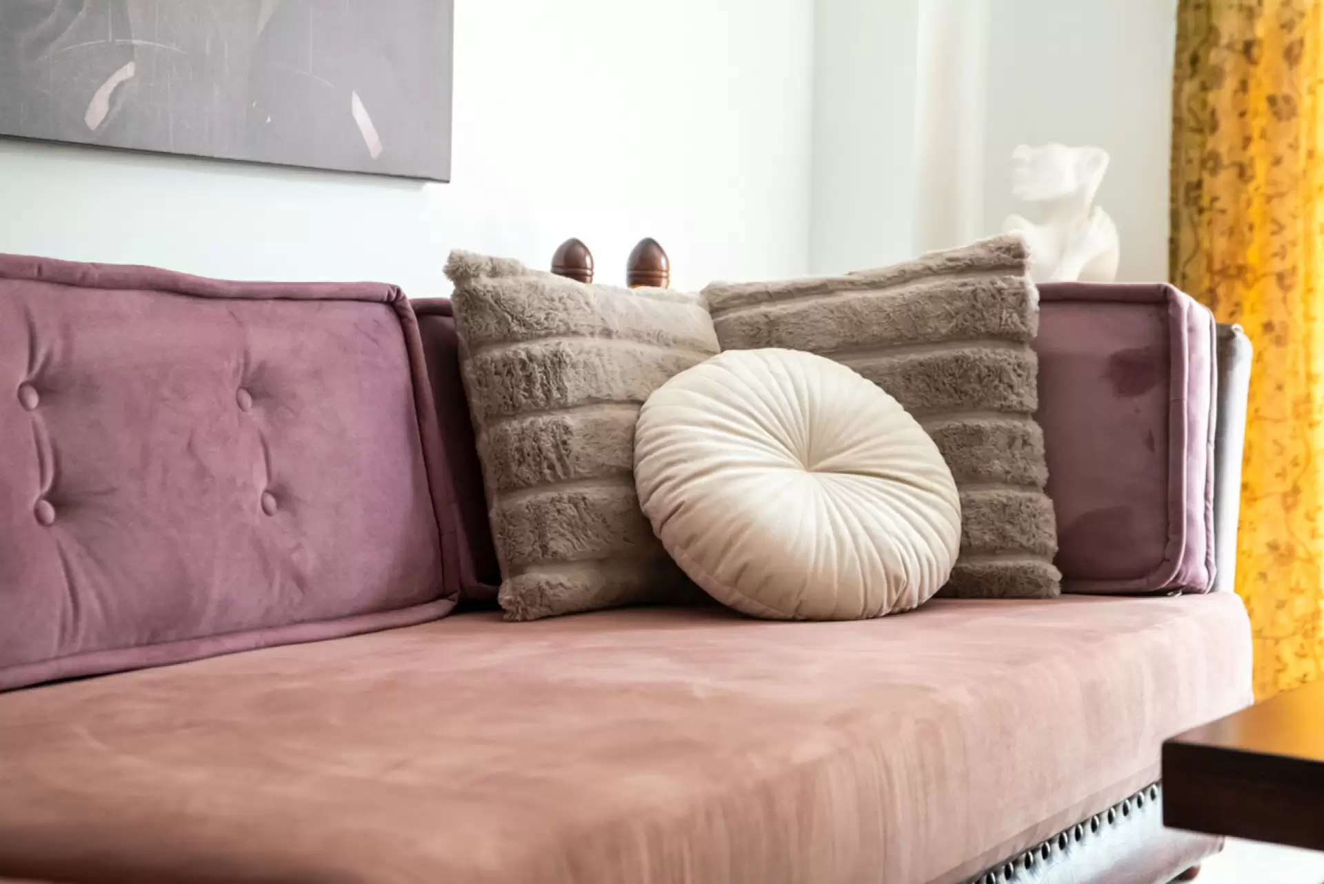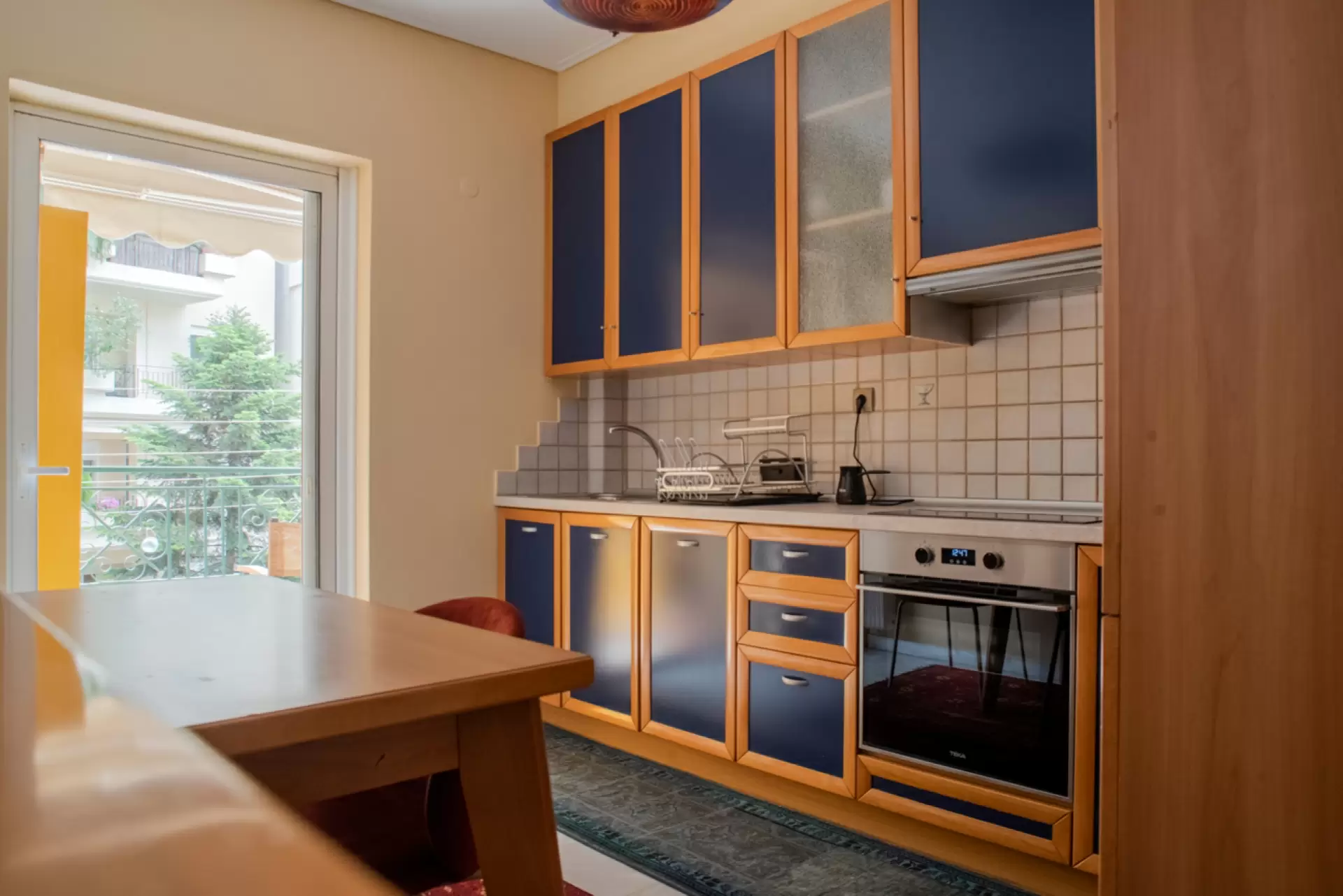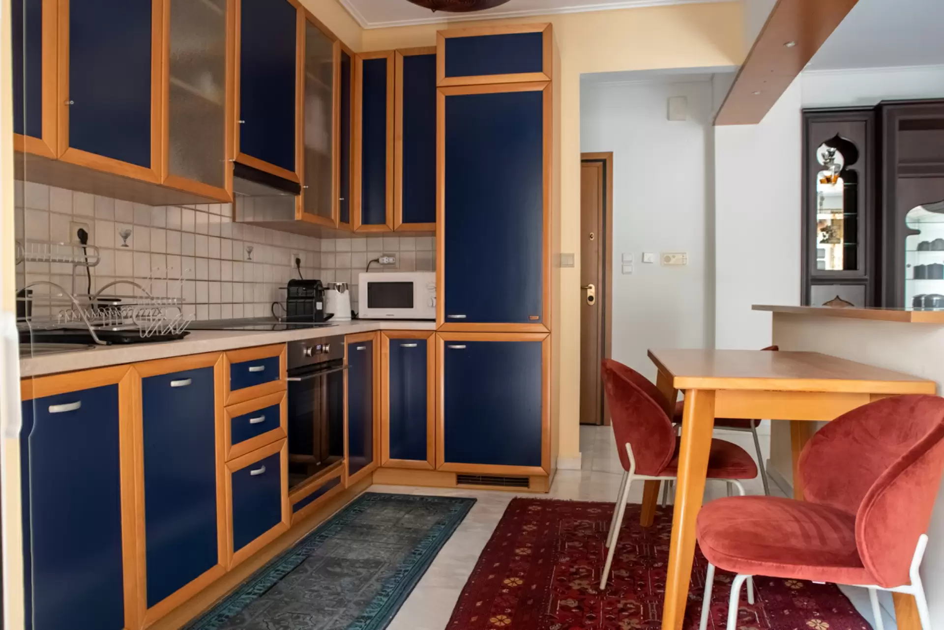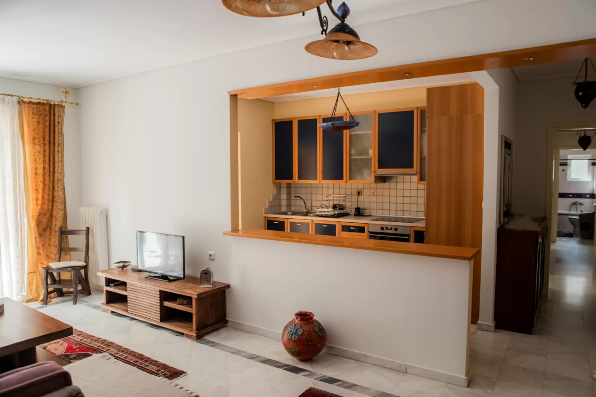 Entering this apartment, you will find a comfortable living room with a cozy sofa and high-tech flat screen TV for your entertainment needs. Additionally, the kitchen is fully equipped with all the necessary stuff.